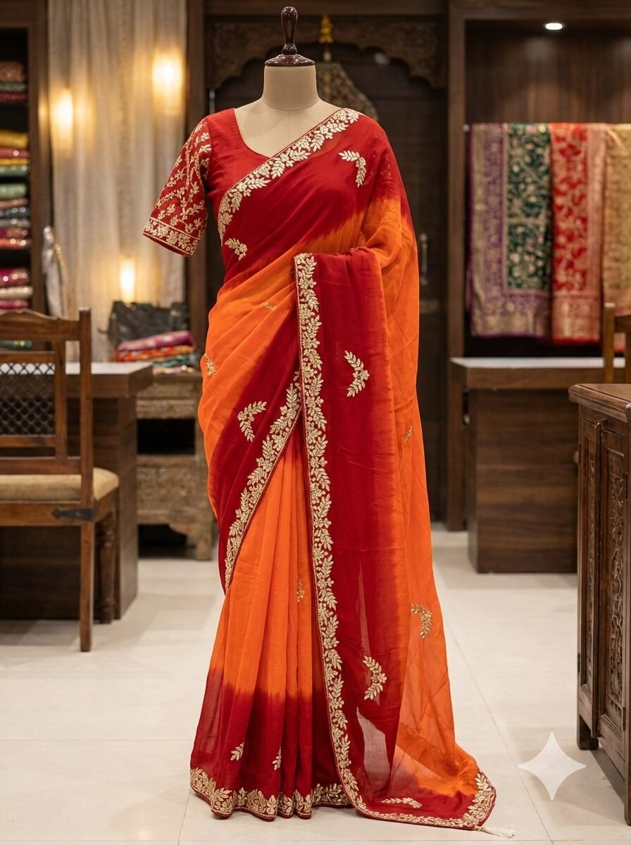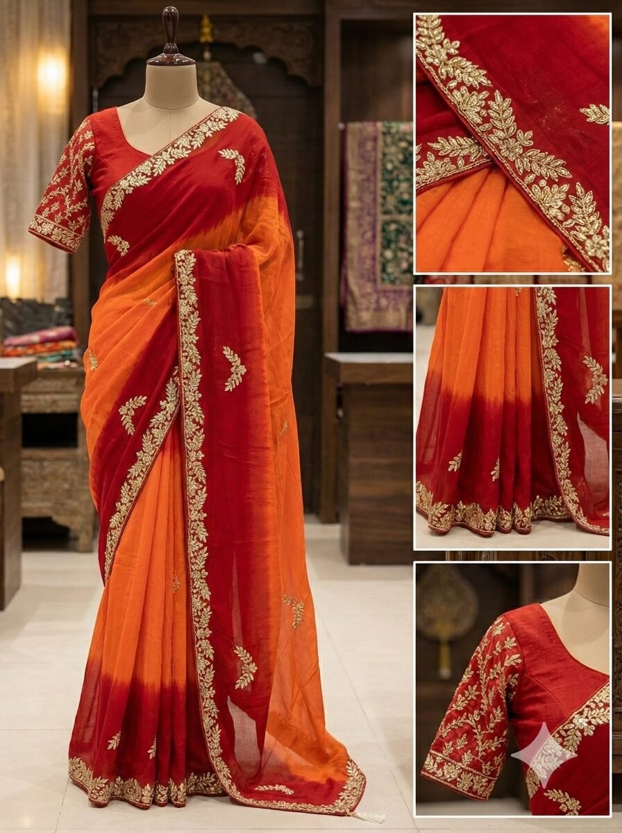 Elevate your ethnic wardrobe with this pure viscose saree featuring exquisite Aari Zardosi handwork, crafted for a luxurious and graceful drape. The stunning red–orange ombré design adds a royal touch, making it perfect for wedding wear, festive saree, and party wear saree collections. Lightweight, elegant, and rich in detail, this designer saree blends traditional craftsmanship with modern sophistication.